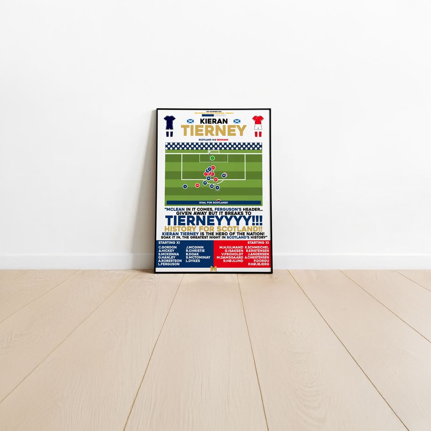 Tierney is known for his fearless defending, relentless work rate, and undeniable commitment to the Scotland badge. This poster captures the spirit of his performance against Denmark — a match full of grit, energy, and unforgettable moments. With modern illustration and sharp detailing, it celebrates one of Scotland’s most complete defenders at his best.