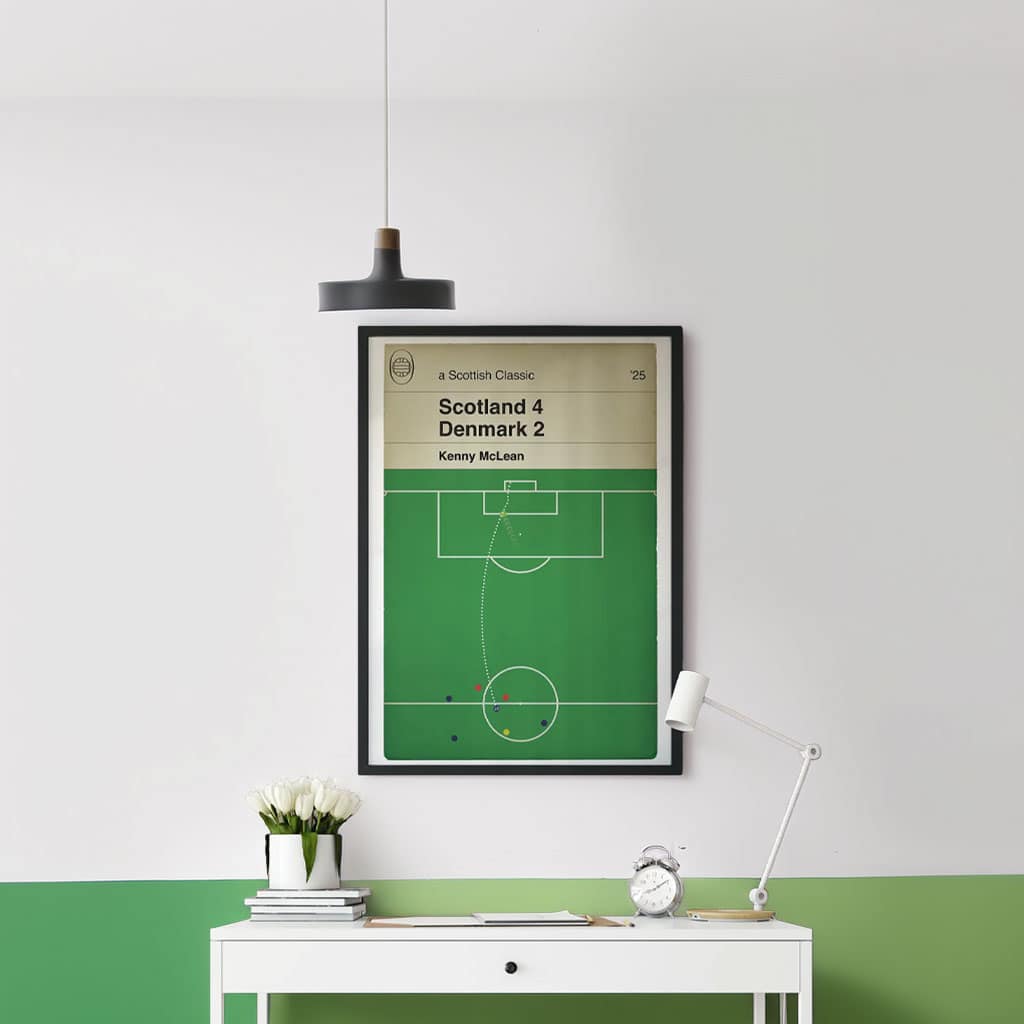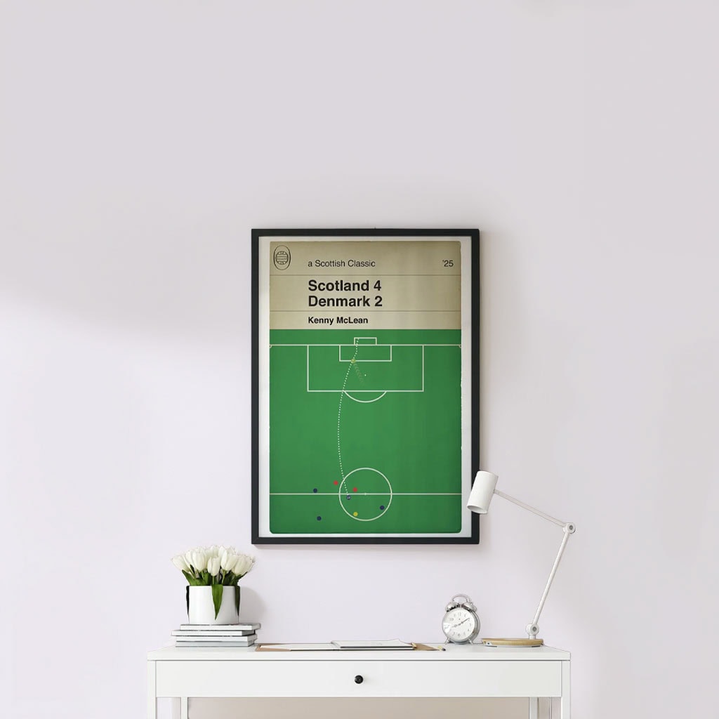 Celebrate one of Scotland’s most electrifying football moments with this Kenny McLean Goal Poster, inspired by the unforgettable Scotland 4–2 Denmark World Cup Qualifier in 2025. This artwork captures the passion, power, and precision of McLean’s decisive strike — a goal that ignited the Tartan Army and pushed Scotland closer to the world stage.