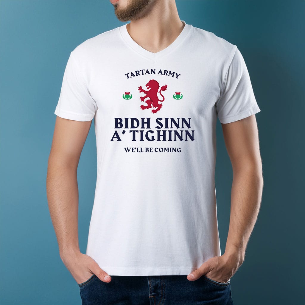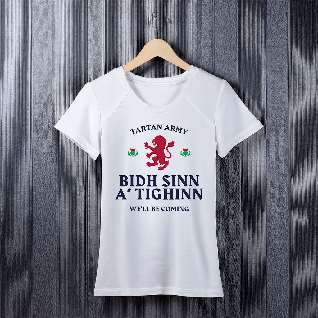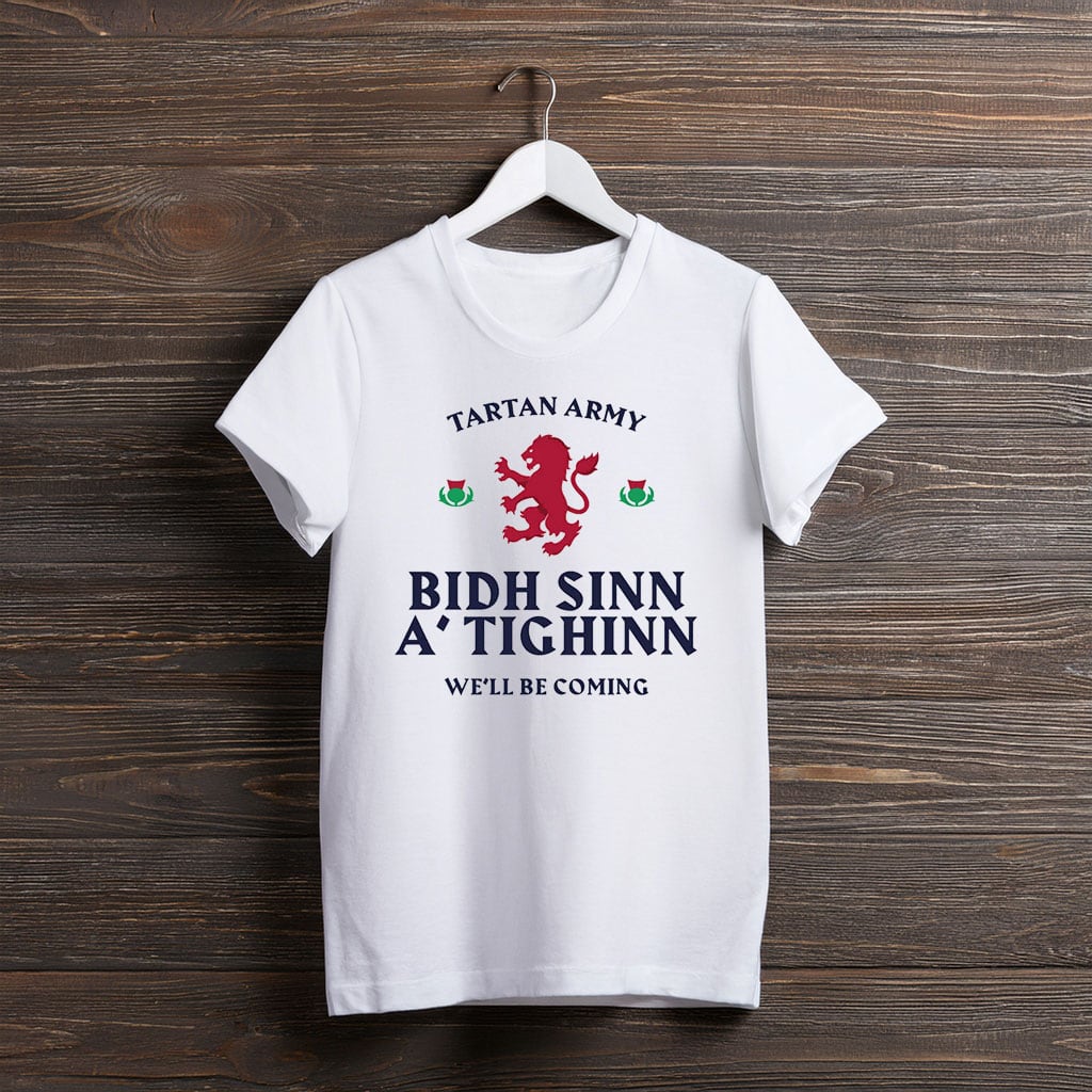 Show your passion and heritage with the Official Tartan Army Gaelic “We’ll Be Coming” T-Shirt, a powerful supporter design inspired by tradition, unity, and the unmistakable spirit of the Tartan Army. Featuring a bold Gaelic message, this t-shirt celebrates loyalty and confidence as fans follow the team wherever the journey leads.