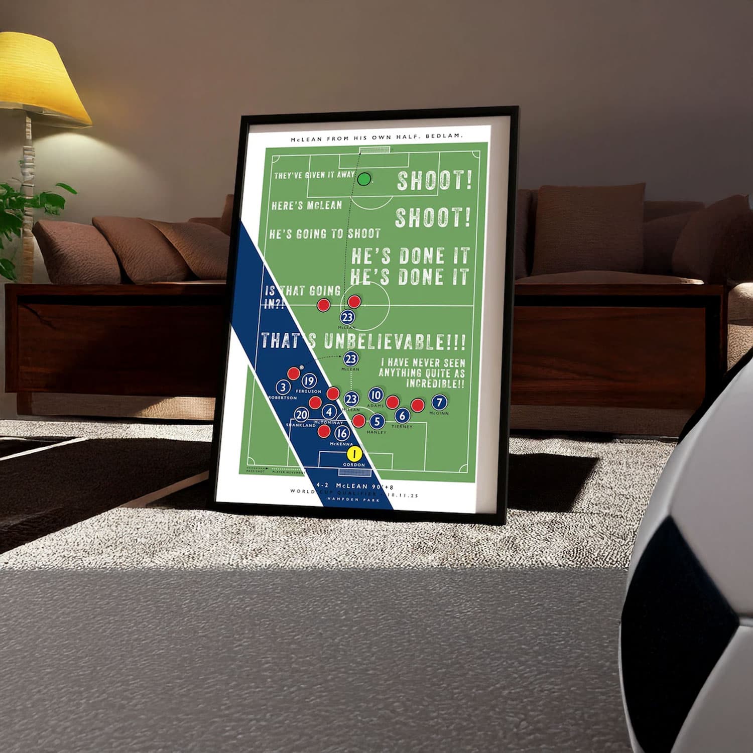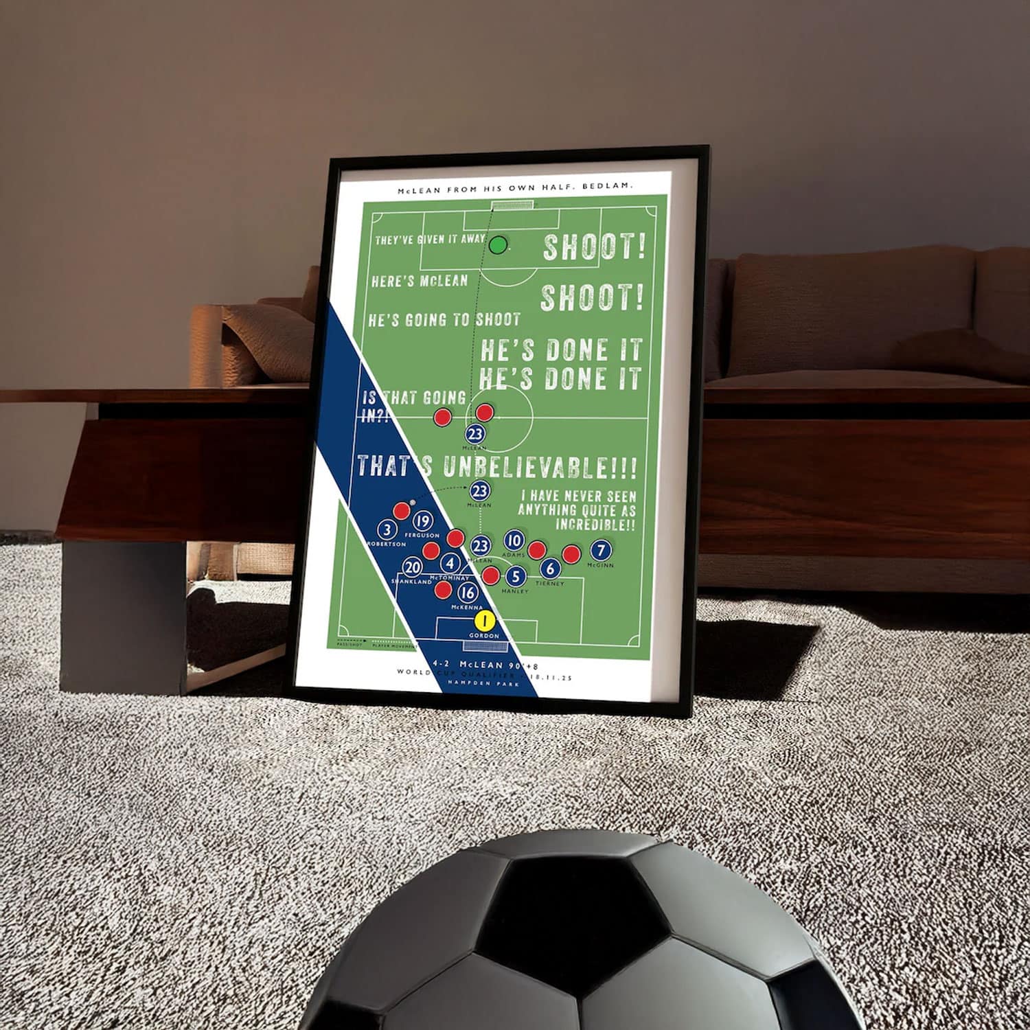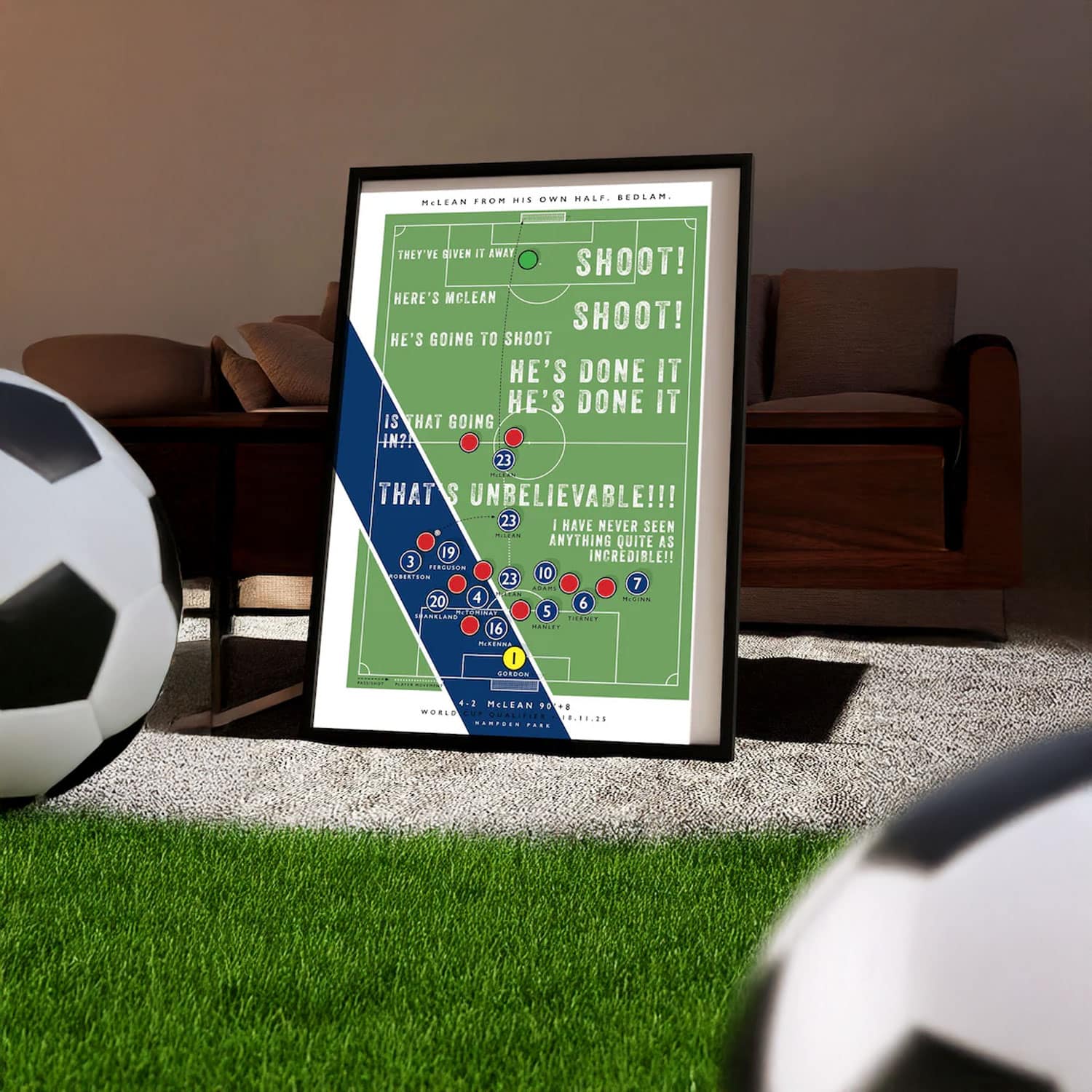 This poster features a dramatic illustration of McLean at the exact second he fired the ball home — the finish that sent fans into chaos and pushed Scotland closer to world football’s biggest stage. With modern football-art styling and subtle tartan detailing, it brings that legendary moment back to life.