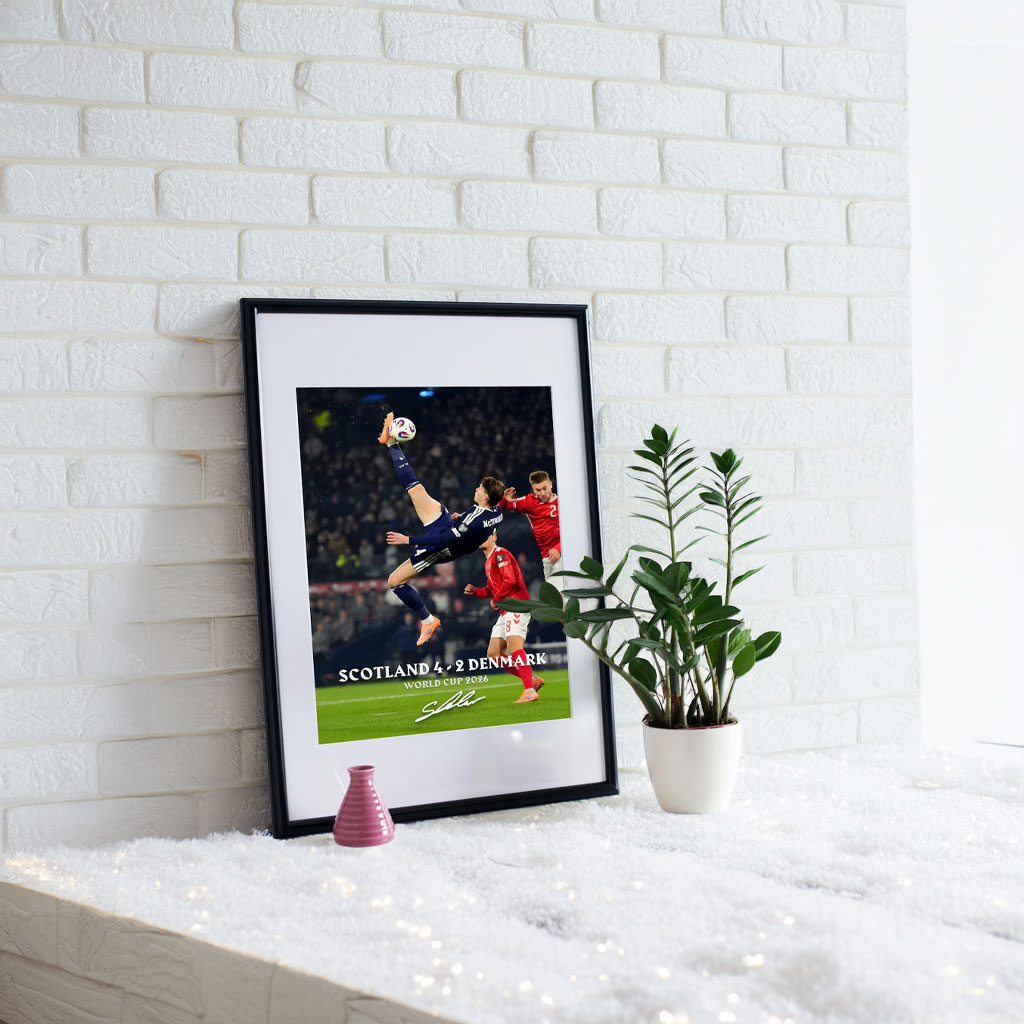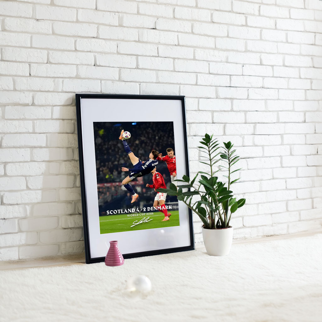 Bring home the pride, passion, and unforgettable excitement of the Scott McTominay Overhead Kick – Scotland World Cup Goal with this powerful poster — a must-have piece for every Scotland fan.