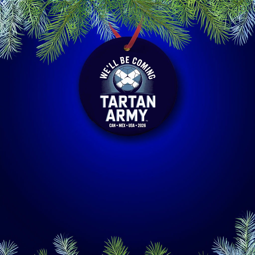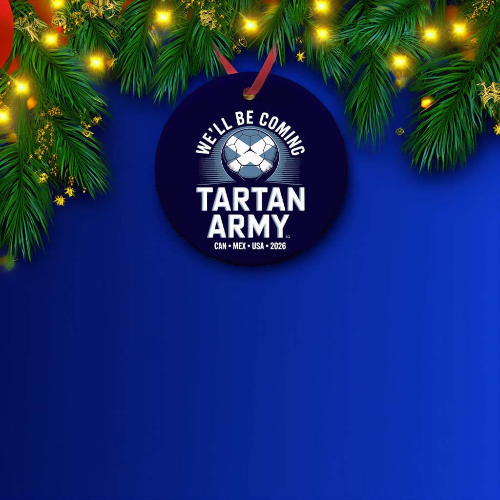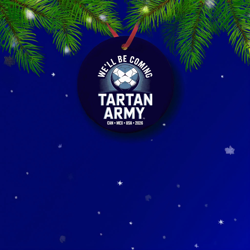This ornament features a bold “We’ll Be Coming 2026” design — inspired by the iconic Tartan Army chant — paired with classic Scottish graphics and a clean football aesthetic.