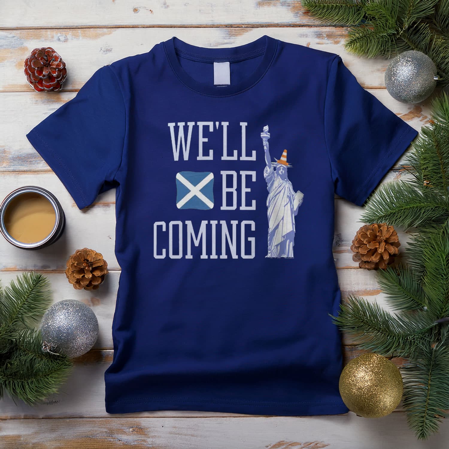 The “We’ll Be Coming” Funny Statue of Liberty Shirt is more than merch — it’s the perfect mix of football pride and playful Scottish banter.