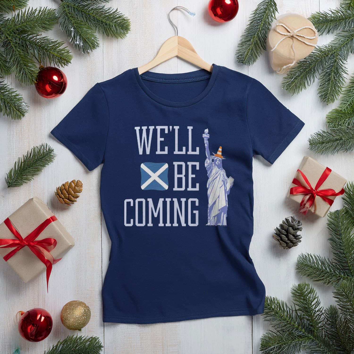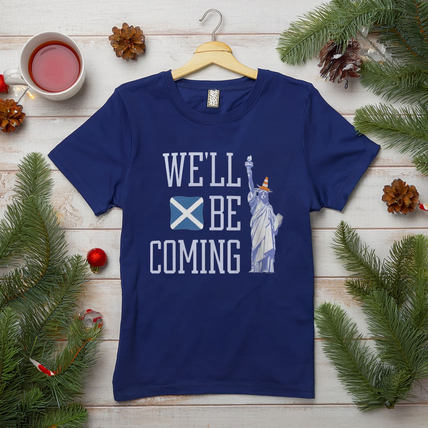 Bring together Scotland’s most iconic chant and one of the world’s most recognizable symbols with the “We’ll Be Coming” Funny Statue of Liberty Shirt — a playful, clever design that blends Tartan Army energy with a humorous Statue of Liberty twist.